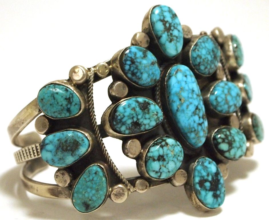 Old Pawn Navajo Spider Web Kingman Turquoise Sterling Silver Cuff Bracelet - R. Tom