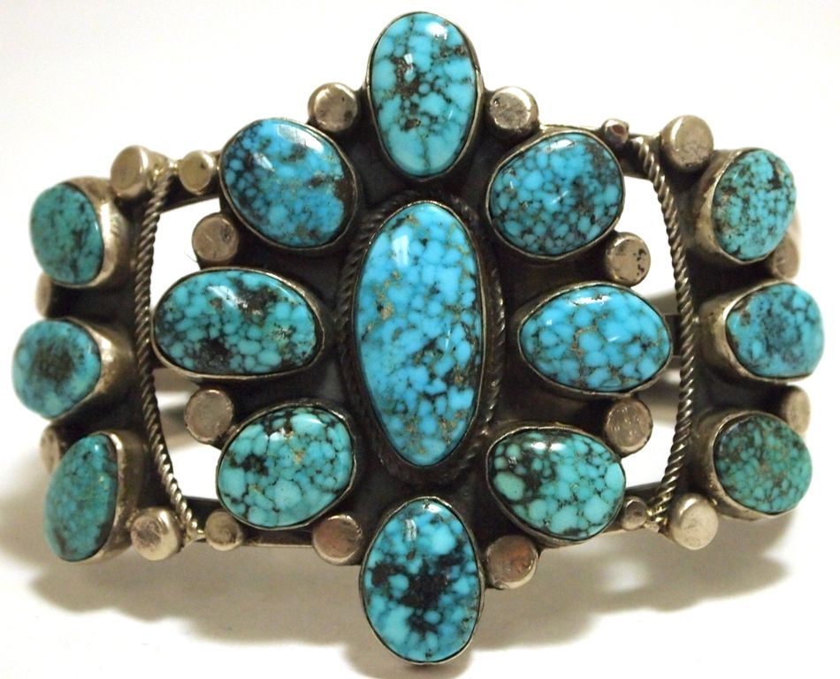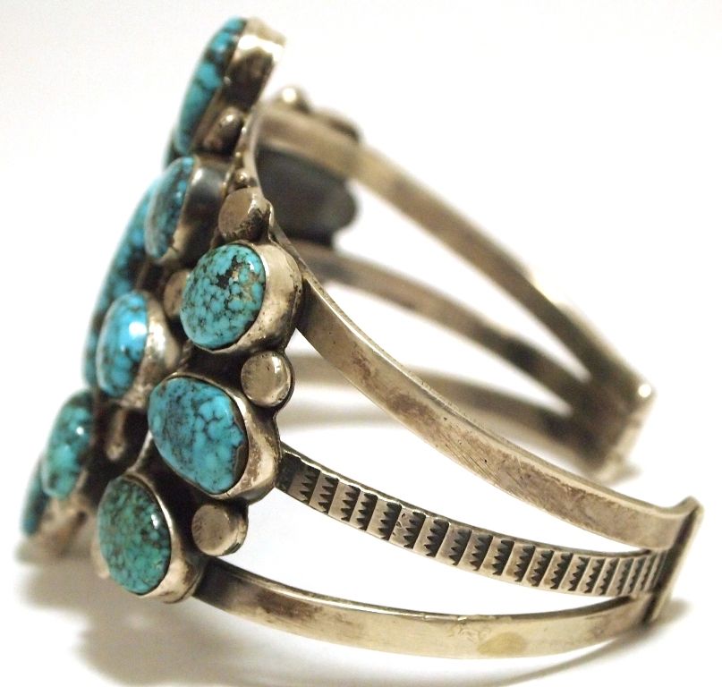 Old Pawn Navajo Spider Web Kingman Turquoise Sterling Silver Cuff Bracelet - R. Tom