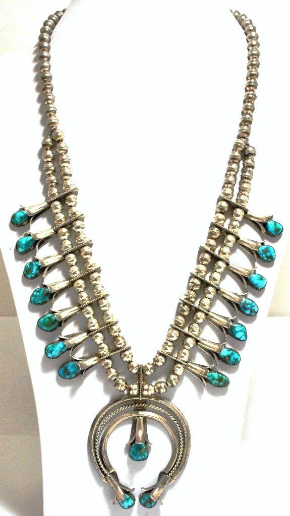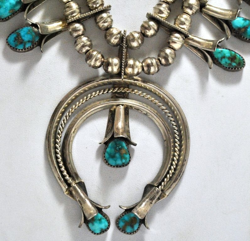 Old Pawn Navajo Spider Web Kingman Turquoise Sterling Silver Squash Blossom Necklace - Doris Smallcanyon