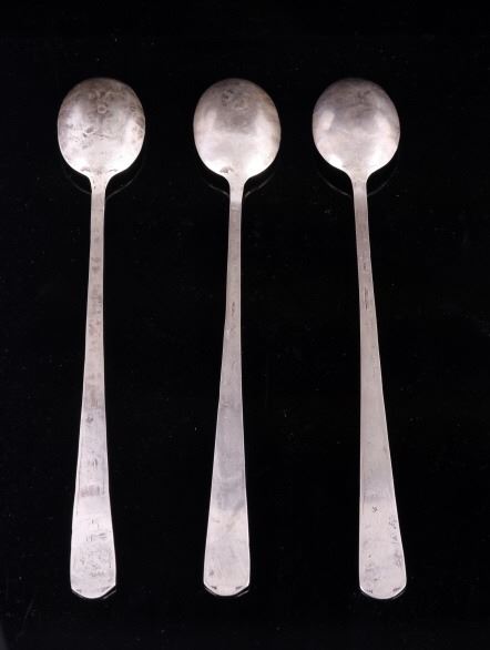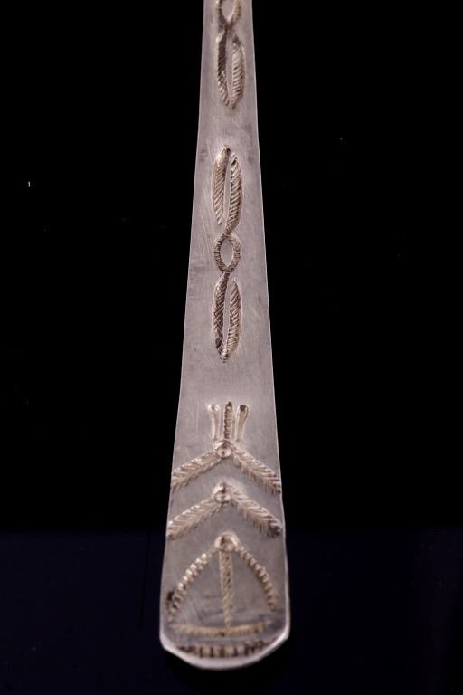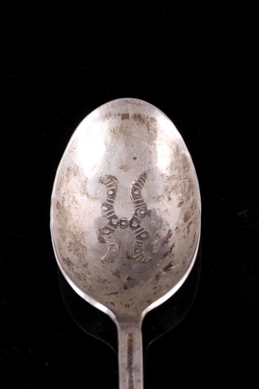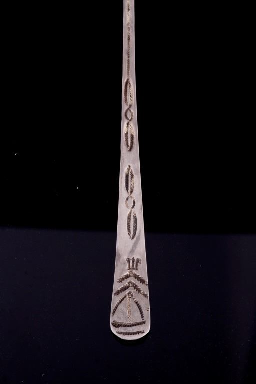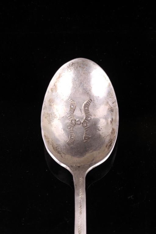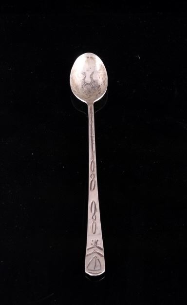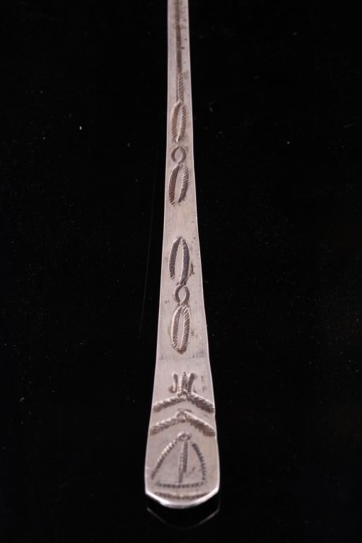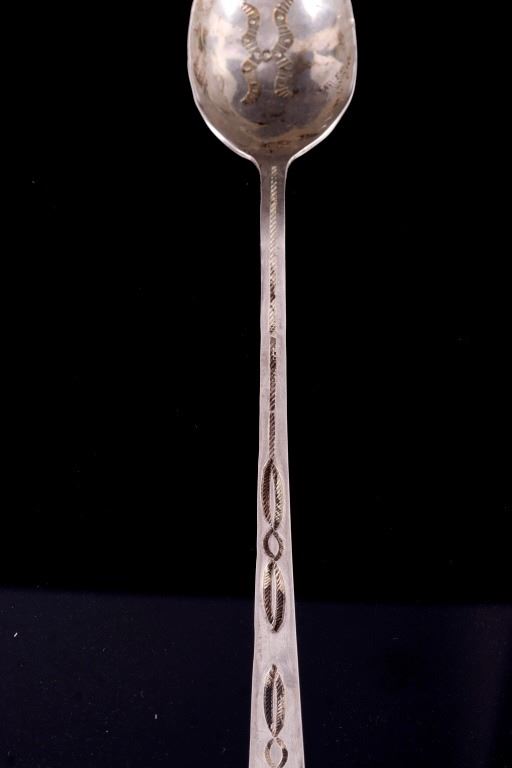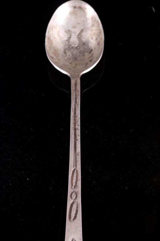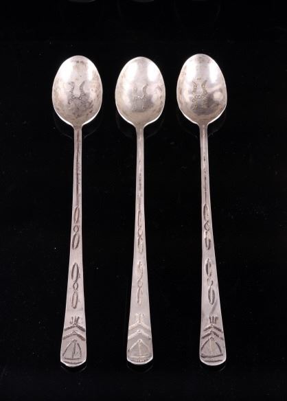 For your bidding pleasure is a set of Old Pawn Navajo sterling silver spoons. Each spoon shows a rich patina relative to their age. The handles and interior of the spoon shows an intricate old pawn style design with feathers and tight line worked into the silver. Each spoon measures 7.75" long and the head measures 1.75" x 1.125".