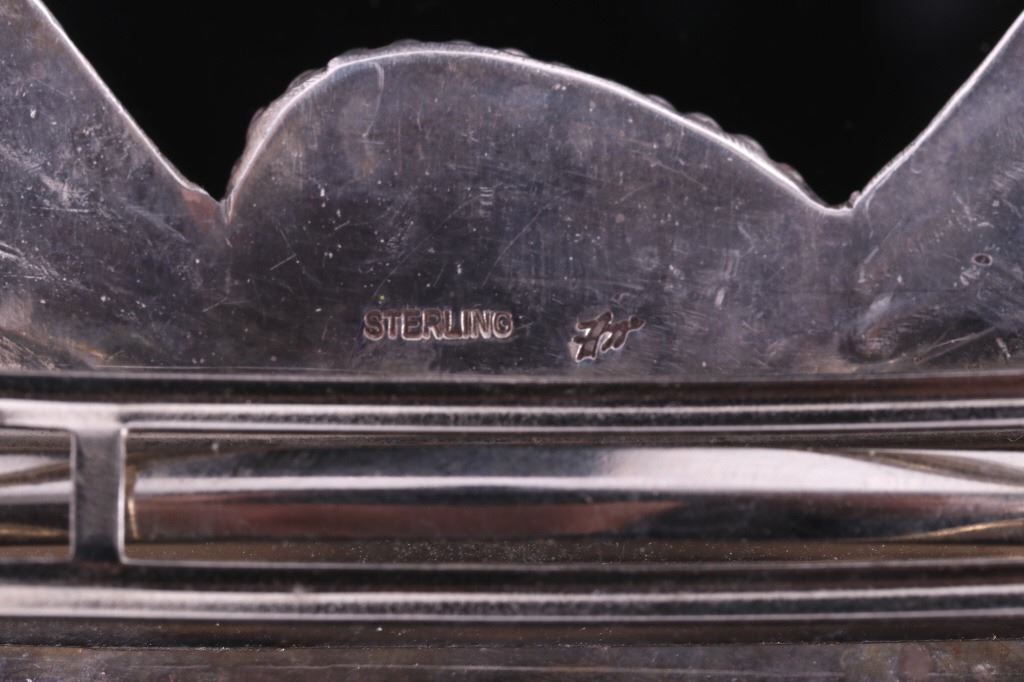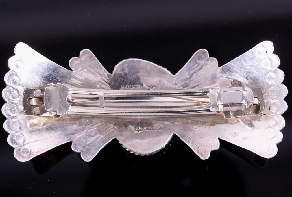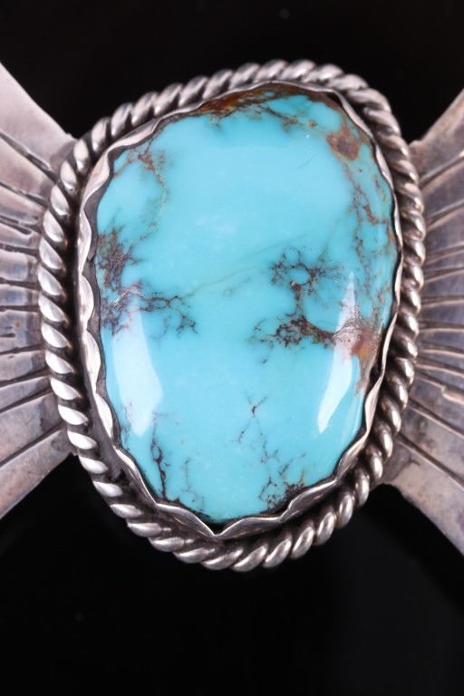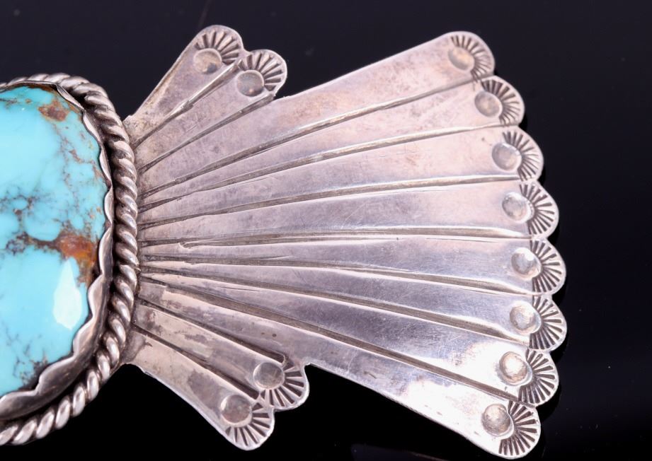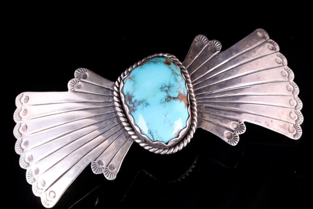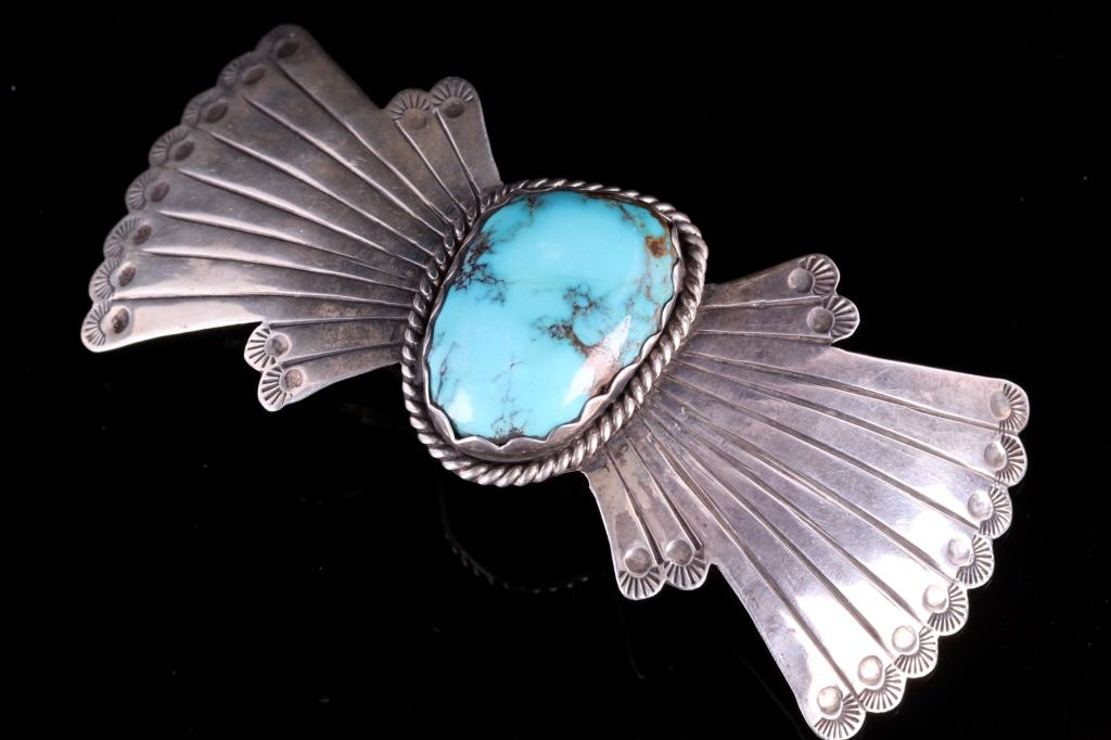 For your bidding pleasure is an OId Pawn Navajo sterling silver and Turquoise Mountain brooch. This brooch incorporates a large 1.5" x 1" Turquoise Mountain gemstone, and traditional western Old Pawn design. The reverse is signed and stamped "sterling". Brooch measures 4.5" x 2".