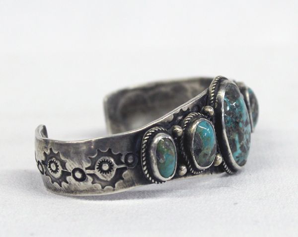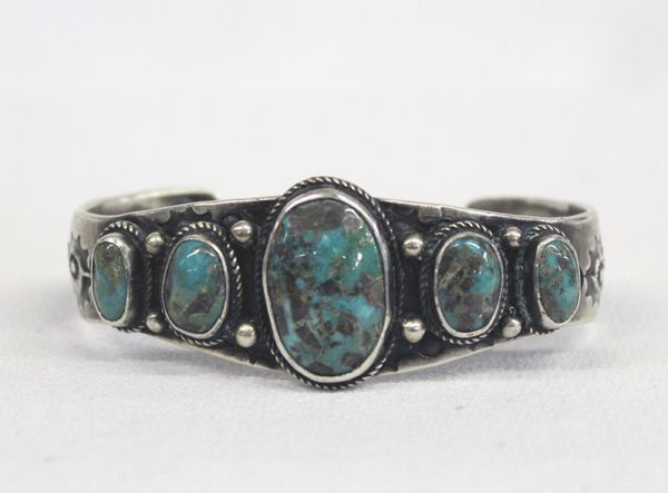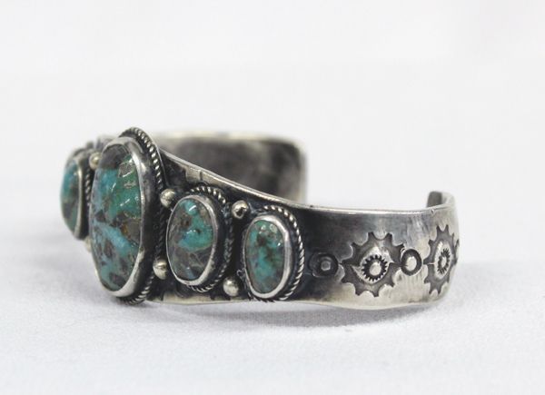 Fabulous Old Pawn Navajo Sterling Manassa Turquoise Bracelet, inside measures 6.25'' which includes opening x 1''W, features 5 beautiful blue green Manassa Turquoise cabochons with the largest measuring .75''L x .5''W, very old traditional style setting of twisted sterling rope borders around bezel set stones and silver bead accents, there are also lovely hand stamped full suns on both sides of the bracelet, 34.89g in total wt.