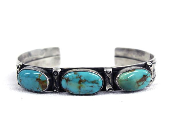 Old Pawn Navajo Sterling Turquoise Bracelet, inside measures 7'' which includes opening x .5''W, features 3 amazing blue green bezel set turquoise cabochons measuring .75'' x .5'', traditional style setting, hand stamped band, 34.93g in total wt.