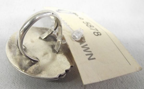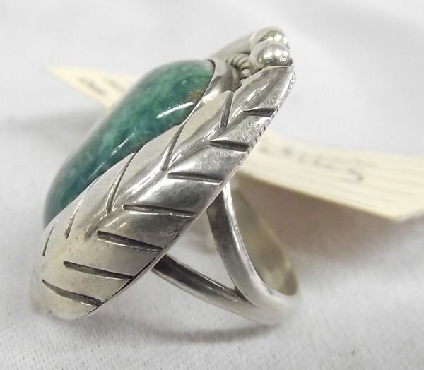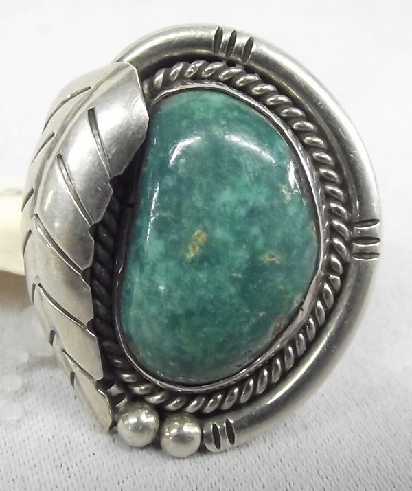 Old Pawn Navajo Sterling Turquoise Ring, beautiful blue green turquoise cabochon 1'' x .5'', cab is accented by twisted silver rope, 2 silver beads and traditional leaf to one side, size 6, measures 1.25'' x 1''