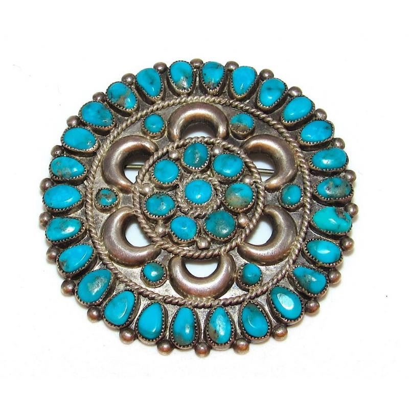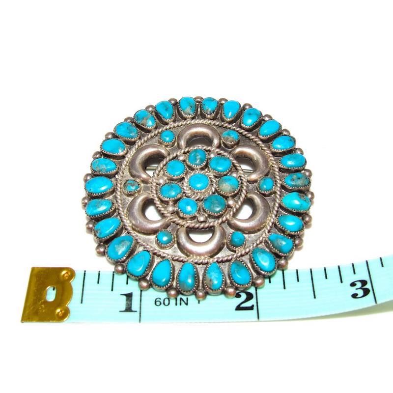 Outstanding vintage Navajo sterling silver and turquoise cluster brooch pin in nice vintage condition. Measures about 2" in diameter, all stones are original and intact. Unmarked as most vintage Native jewelry and has been tested for silver content. Wonderful collector piece. FREE SHIPPING ON ALL JEWELRY ORDERS WITHIN THE US! WE SHIP ALL ITEMS IN-HOUSE!