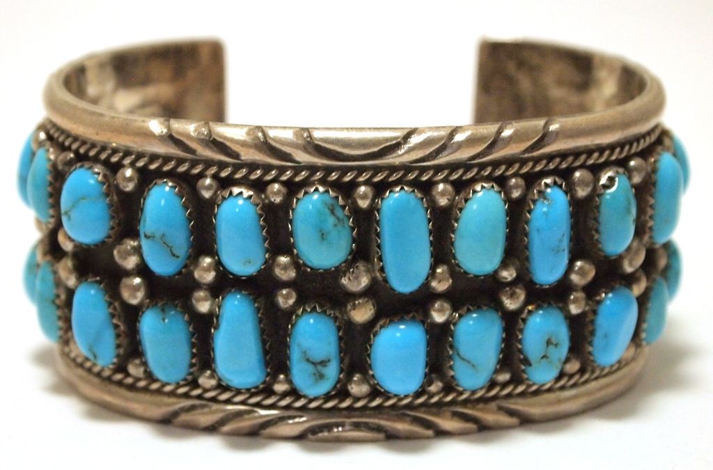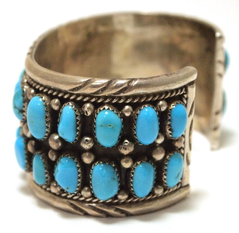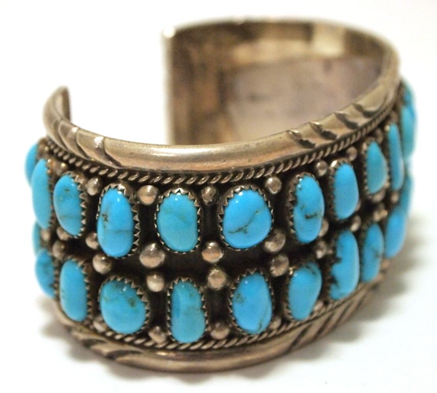 Old Pawn Navajo Turquoise Cluster Sterling Silver Cuff Bracelet - IC