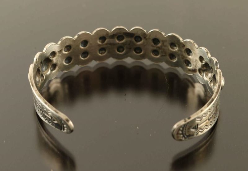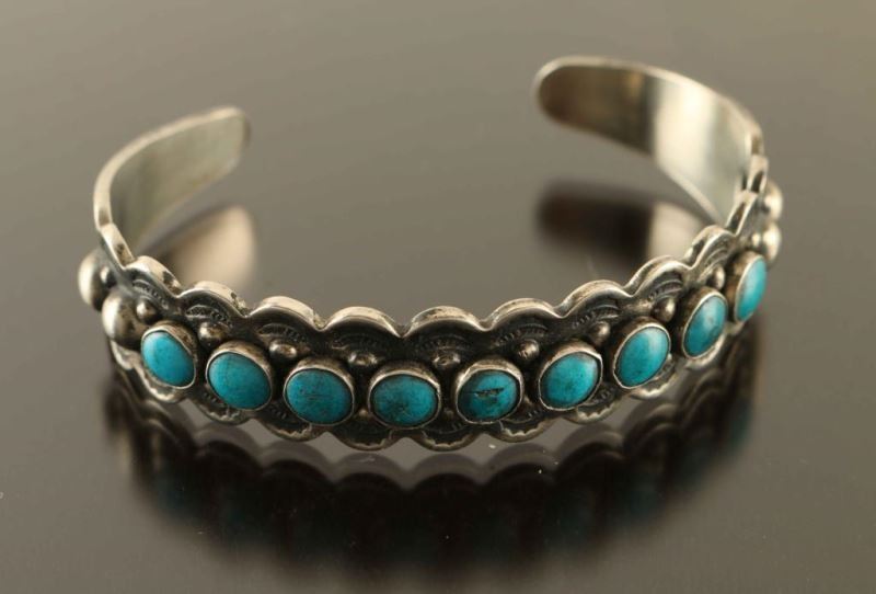 Sterling silver scallop design cuff with stamped ends holds nine round turquoise stones. Small imperfection/chip in one stone.