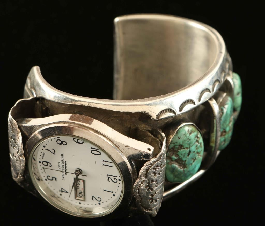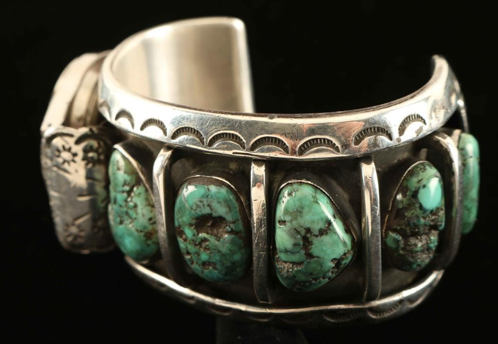 Wide 1 1/2" silver cuff set with five natural turquoise nuggets with a watch on one end. Circumference 7" total.