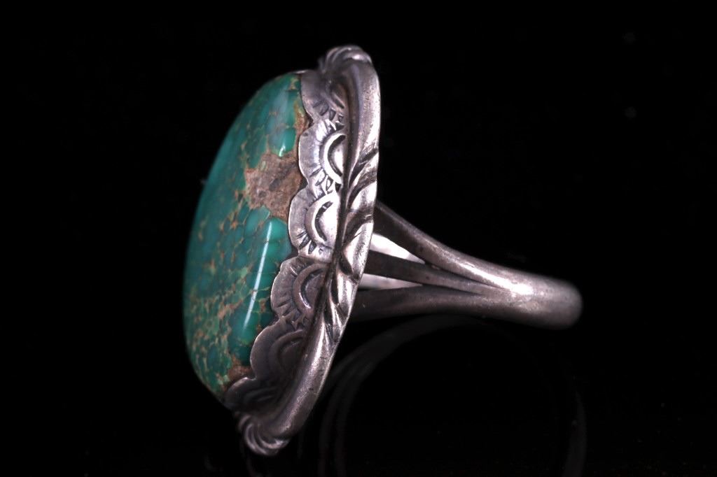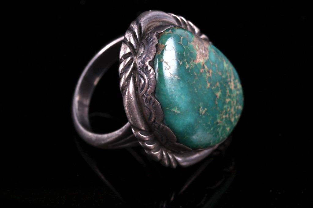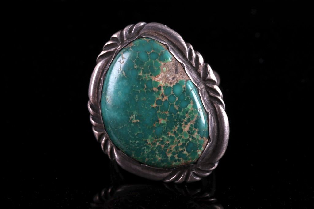For your bidding pleasure is an Old Pawn Pilot Mountain turquoise ring. The ring features an aged green Pilot Mountain turquoise gem stone set in a shadow box case. Ring is in great condition for the age and measures size 6 US.