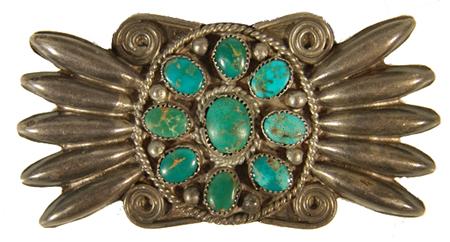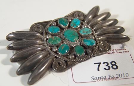 Wonderful sterling pin set with nine old natural turquoise stones - classic piece. 2-1/2" x 1-1/4"