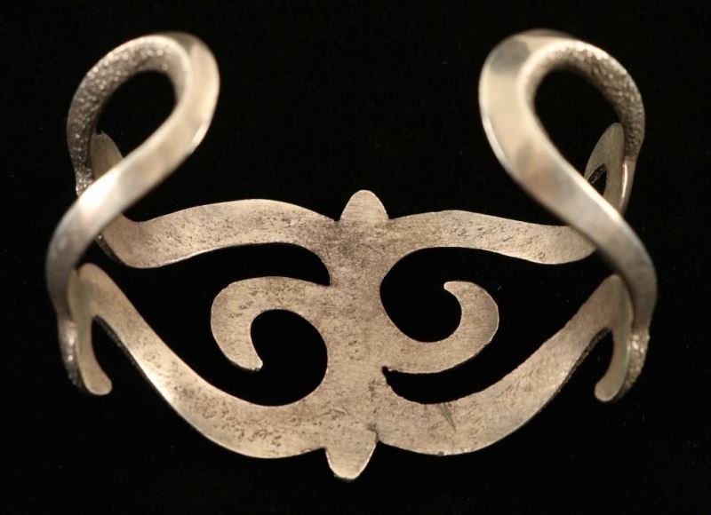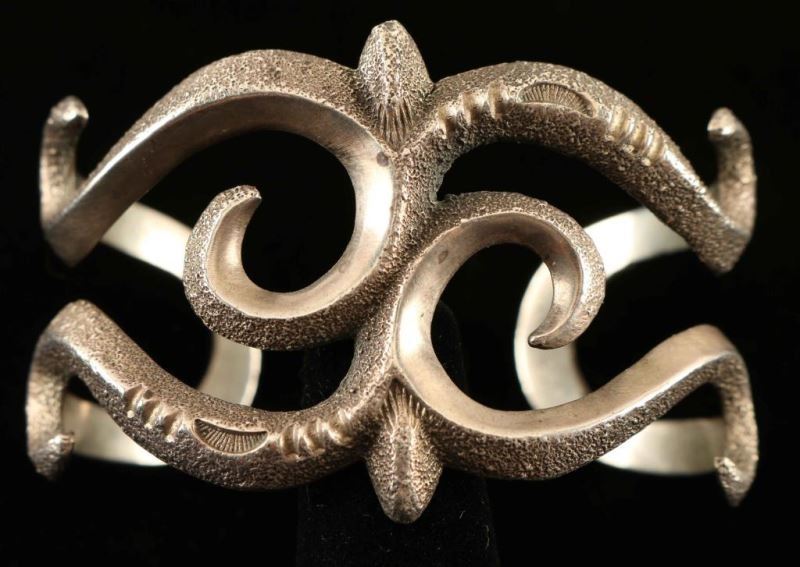 Navajo made sterling silver bracelet with swirl motif. Measures 1 5/8"w inside 2 1/4".