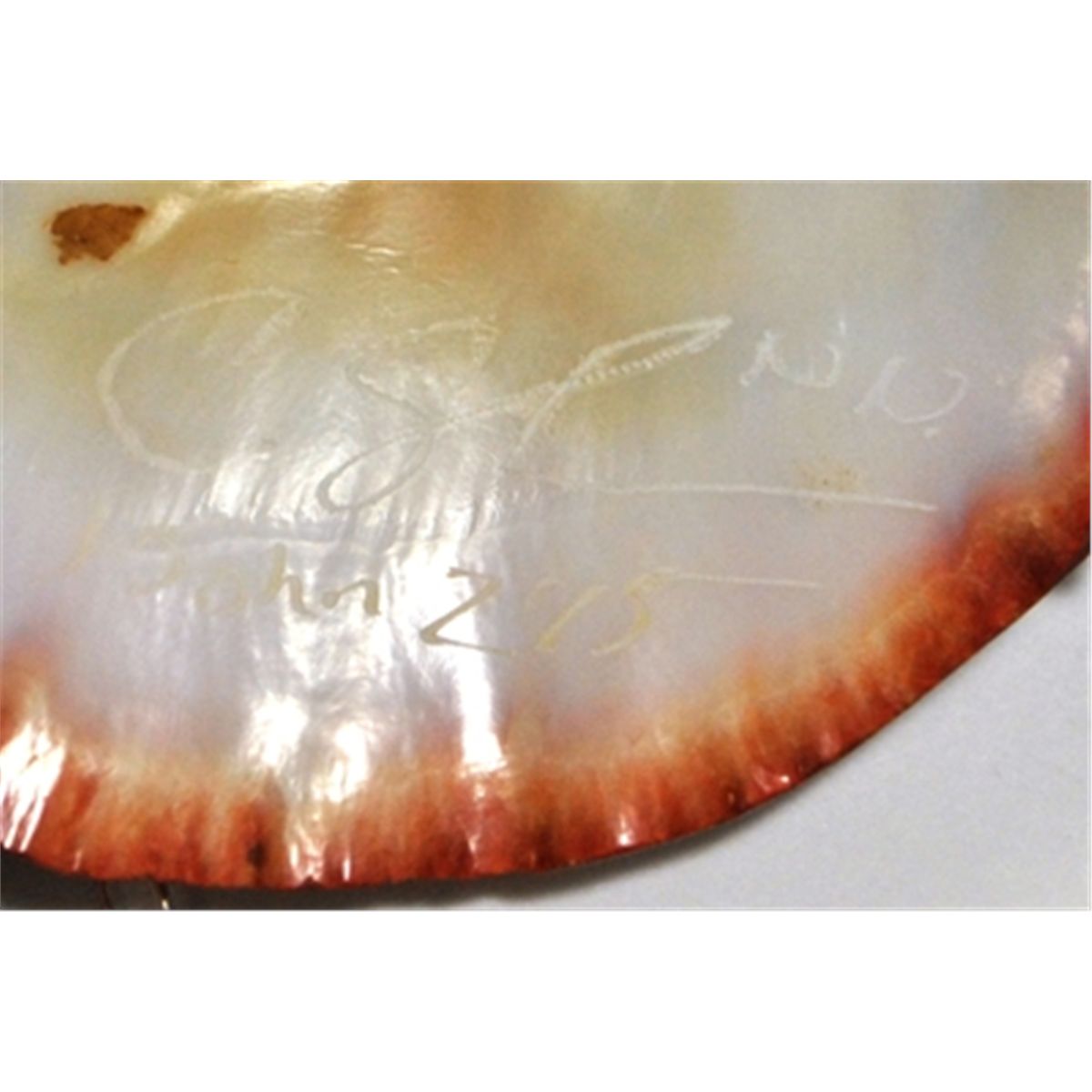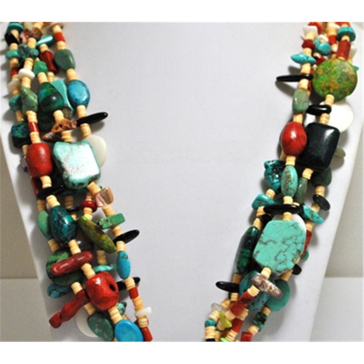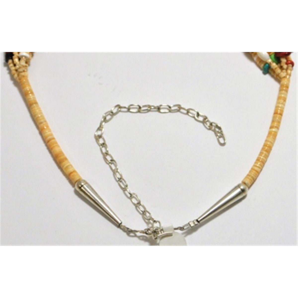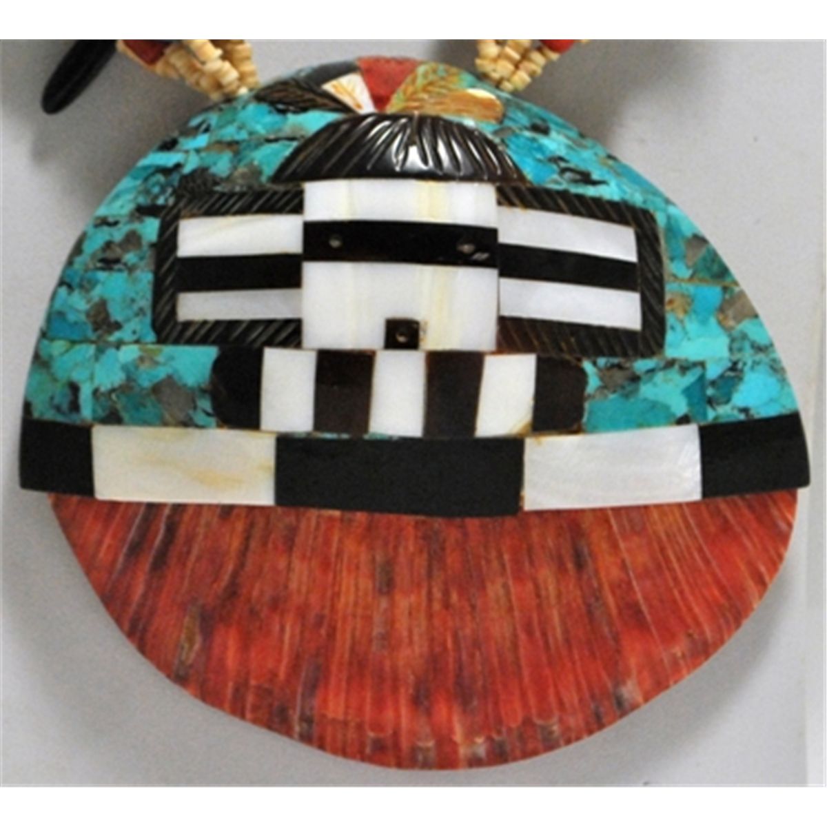 Measures 36" around. Main shell measures 3-1/2" tall by 3-7/8" wide and has "CSL NN John 2:15" inscribed on the back (see picture). Stones present: Various Blue & Green Turquoises, Mother of Pearl, Malachite, Onyx, Coral, Spiny Oyster, Shell.