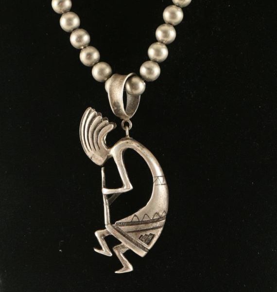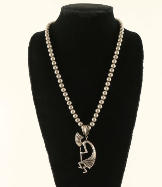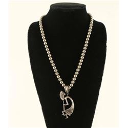 Smooth desert pearls with large bale with a Kokopelli pendant. Hook and eye closure.