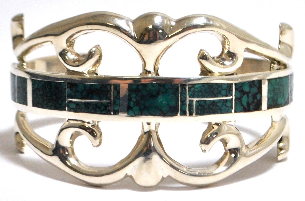 Old Pawn Spider Web Kingman Turquoise Inlay Sterling Silver Cuff Bracelet