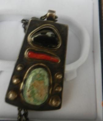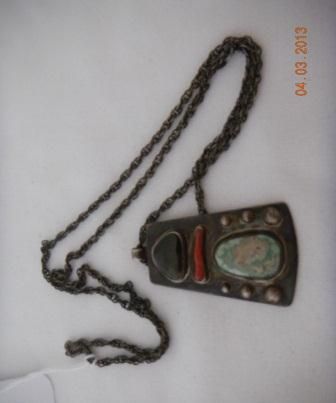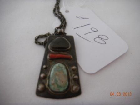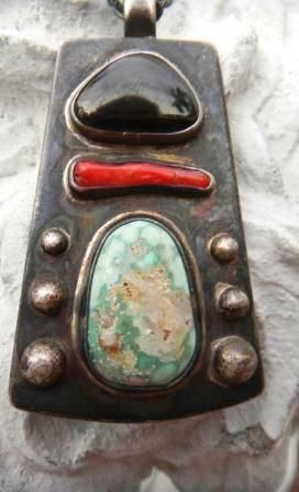 Sterling Silver Pendant with Turquoise, Coral and Obsidian Stones. This item is old pawn from the 1920's. The item measures 24 inches, the pendant is 1 3/4 by 1 1/4 inches. The item is shiny black from Patina