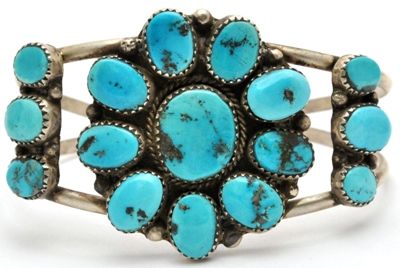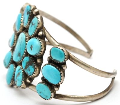 Old Pawn Turquoise Cluster Sterling Silver Bracelet