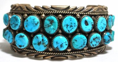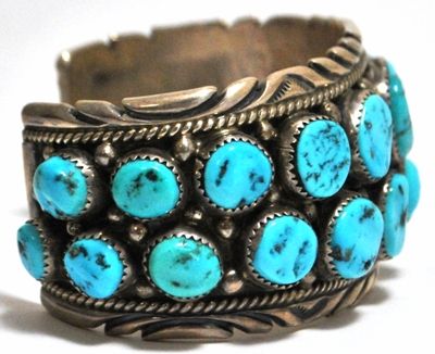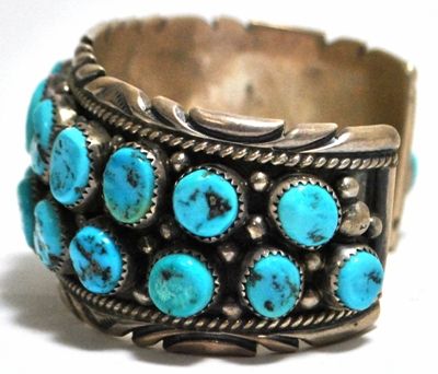 Old Pawn Turquoise Cluster Sterling Silver Cuff Bracelet - R