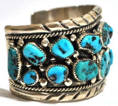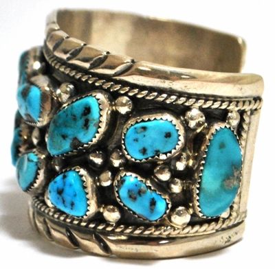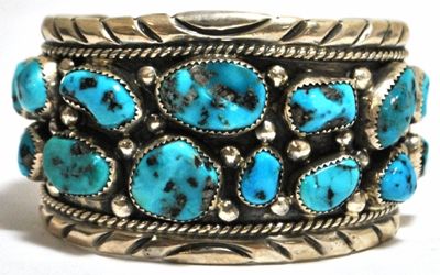 Old Pawn Turquoise Cluster Sterling Silver Cuff Bracelet - T. Benally
