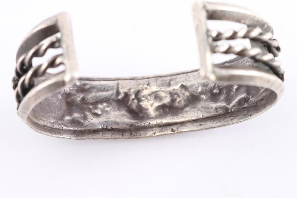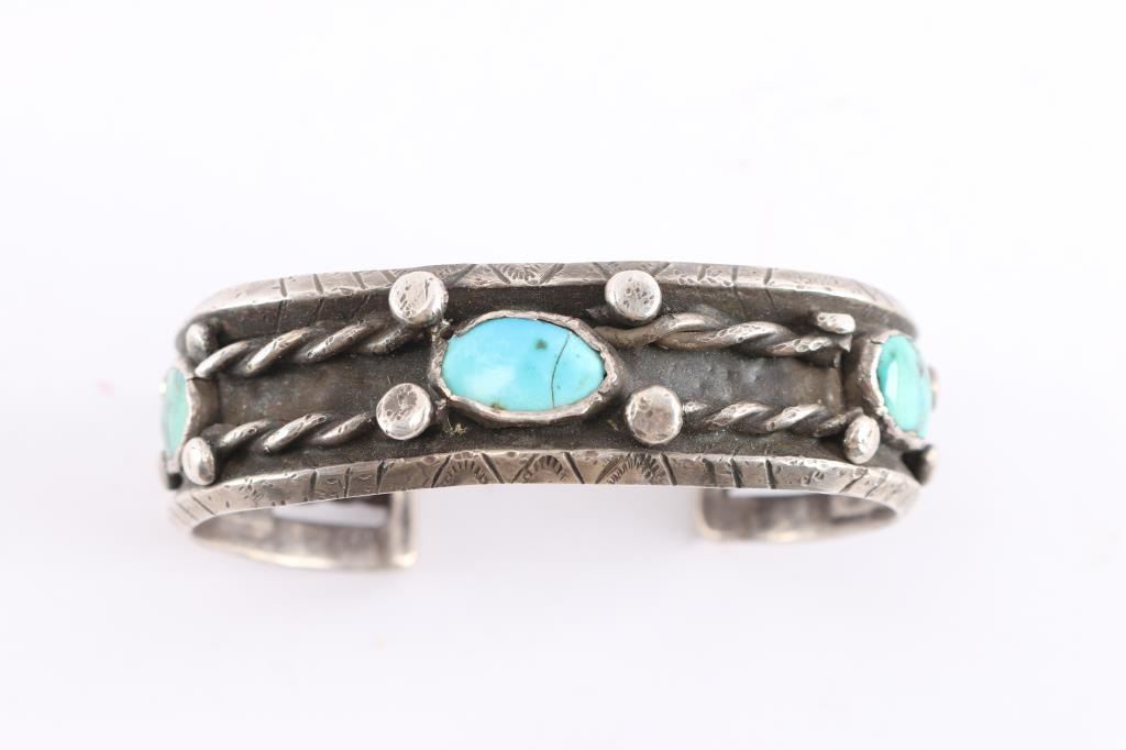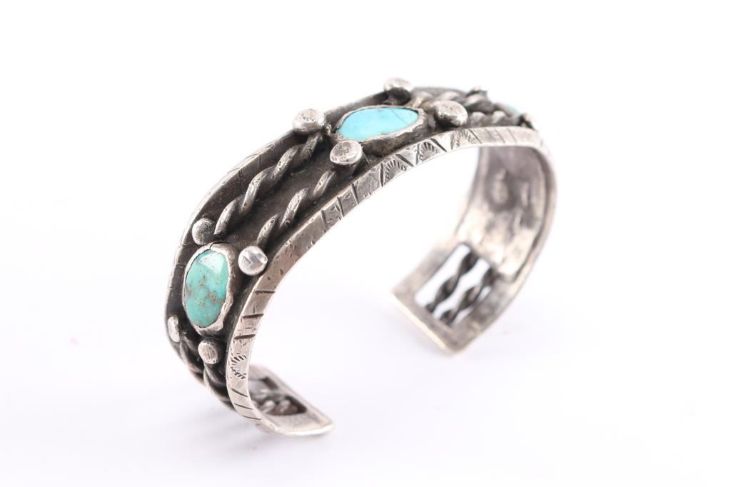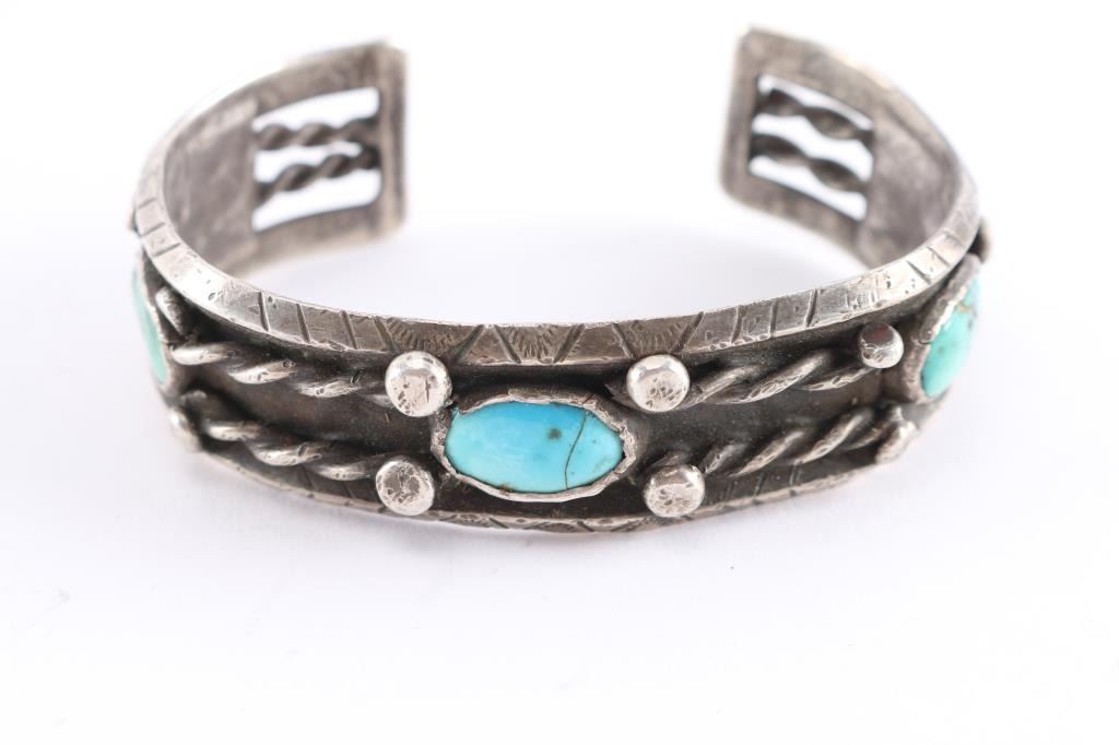 Measures 8" with gap. Three turquoise oval stones, middle stone has crack.