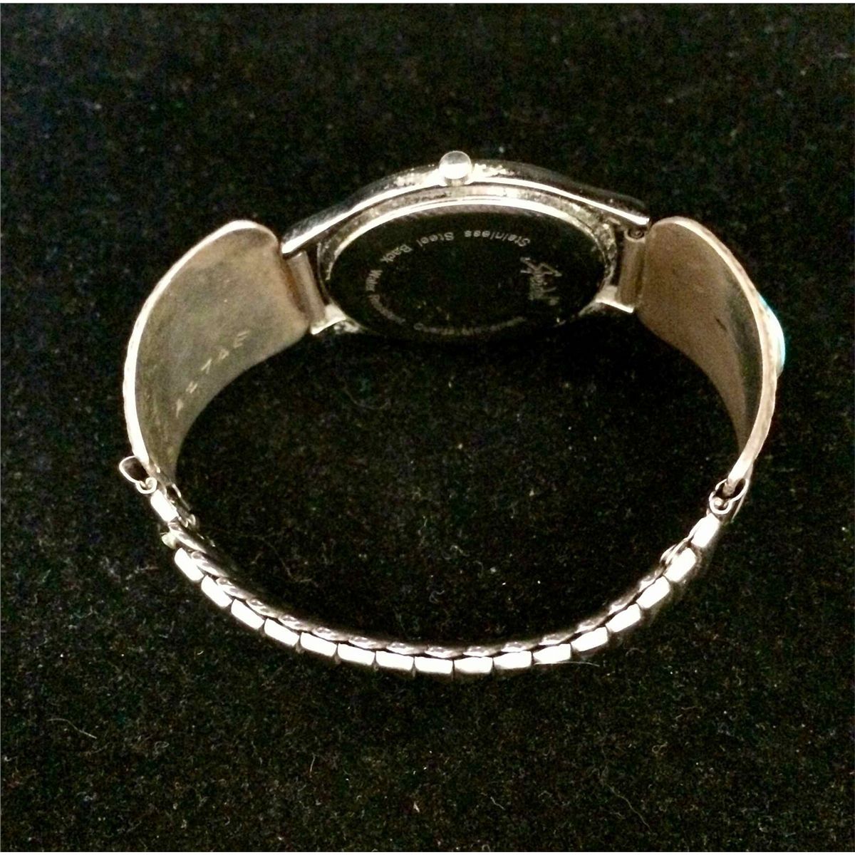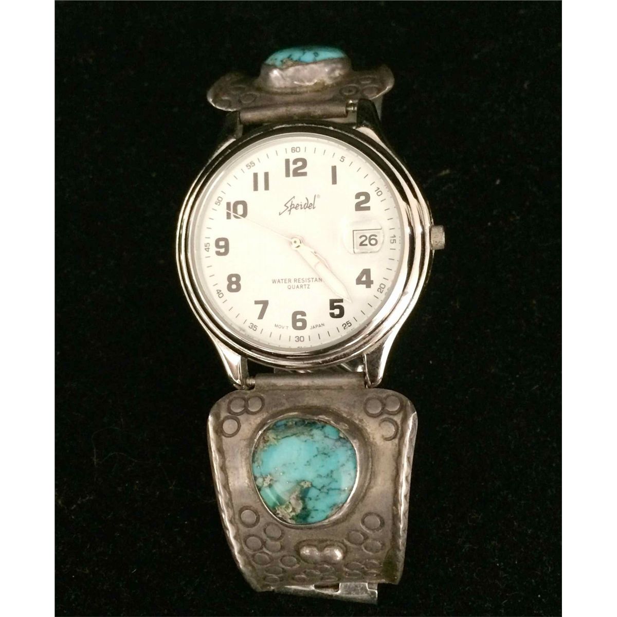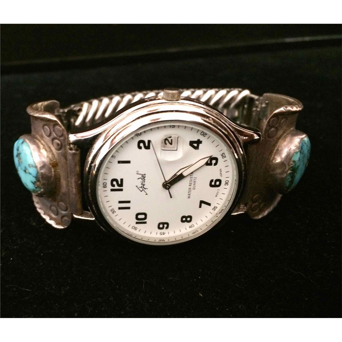 A working watch with Navajo style watch tips and a stretch band. No makers Hallmark, but tested a sterling silver. Has two beautiful turquoise cabochons.