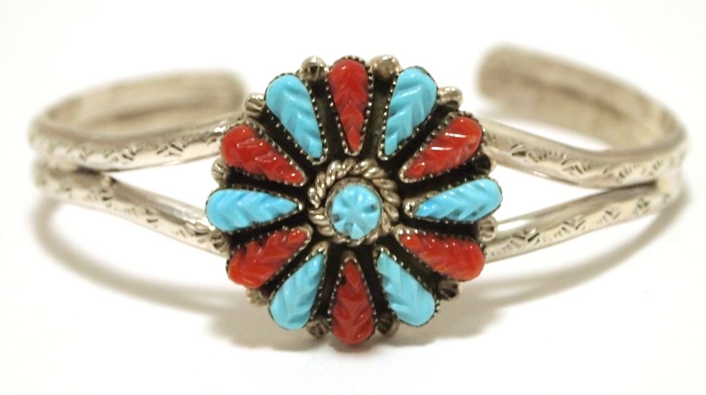 Old Pawn Zuni Coral & Turquoise Sterling Silver Cuff Bracelet - Robert Eustace