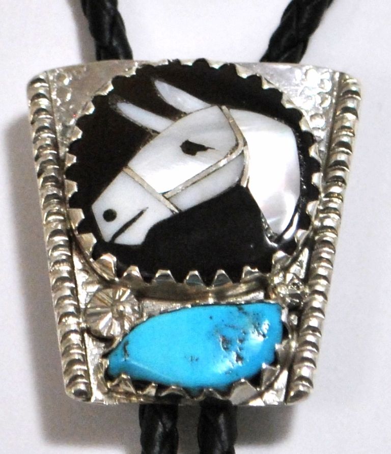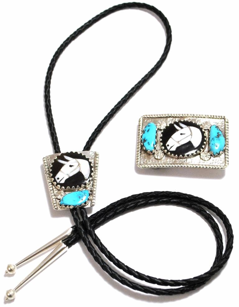 Old Pawn Zuni Multi-Stone Inlay Horse Sterling Silver Bolo Tie & Buckle Set - Isabelle Simplicio