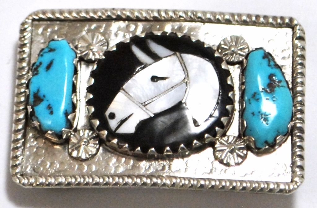 Old Pawn Zuni Multi-Stone Inlay Horse Sterling Silver Bolo Tie & Buckle Set - Isabelle Simplicio