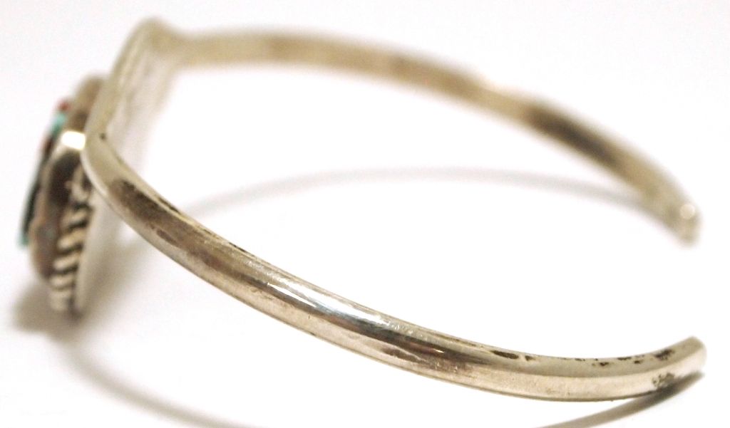 Measures 5-1/2" around with a 1-1/8" gap, 7/8" wide. Stones present: Onyx, Coral, Turquoise, Mother of Pearl.
