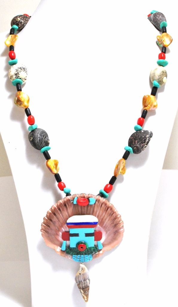 Measures 26" around. Bottom shell pendant measures 4" tall by 3" wide (including shell hanger). Stones present: Shell, Black Jet, Turquoise, Coral.