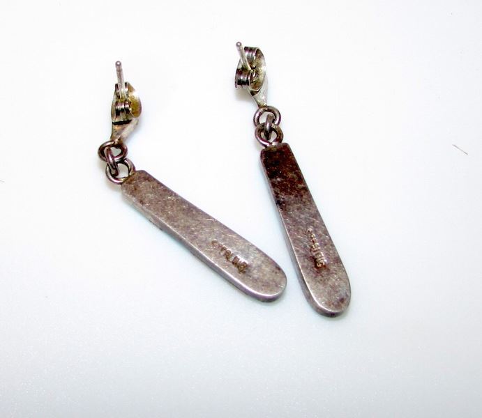 For your consideration is a pair of these fabulous vintage Zuni sterling silver inlay pierced dangle earrings in wonderful vintage condition. The earrings feature a traditional Zuni inlay design in sterling silver accented with intricate stone inlay. The earrings measure about 1 3/4" long and are marked "sterling" on the back. Fabulous addition to any jewelry collection!