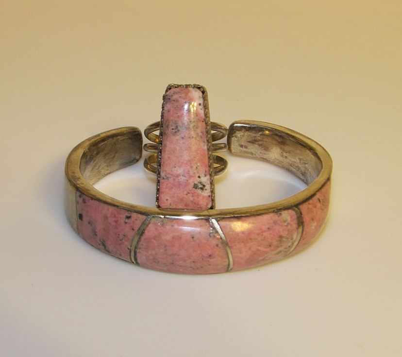 For your consideration is this rare exquisite Old Pawn Zuni sterling silver and pink agate cuff bracelet and ring set in wonderful vintage condition. This gorgeous duo feature intricately inlaid pink agate design in sterling silver. Wonderful quality and attention to detail with significant silver weight. The ring measures 1" wide and is size 7. The cuff bracelet measures over 1/2" wide and is 2 1/4" from side to side. Stamped with the artist's hallmark. Both pieces have been tested for silver content. Outstanding and rare addition to any jewelry collection!