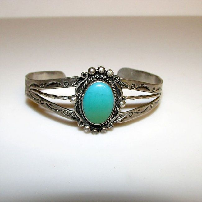 For your consideration is this gorgeous vintage Old Pawn Zuni sterling silver bracelet in wonderful vintage condition. This fantastic example of Native American art features a detailed and really intricate design in sterling silver all around the cuff, accented with a turquoise cabochon in the middle. The cuff is adjustable and measures 1" wide and the inside circumference is about 7 1/2" including the gap. The bracelet is marked "sterling" and is stamped with the artist's hallmark. A wonderful addition to any jewelry collection!