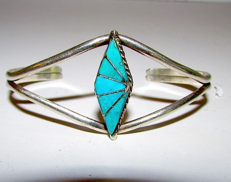 Old Pawn Zuni sterling silver turquoise inlay cuff bracelet. Measures about 1" wide at the widest point, inside circumference is about 6". Can be carefully adjusted. Age appropriate wear.