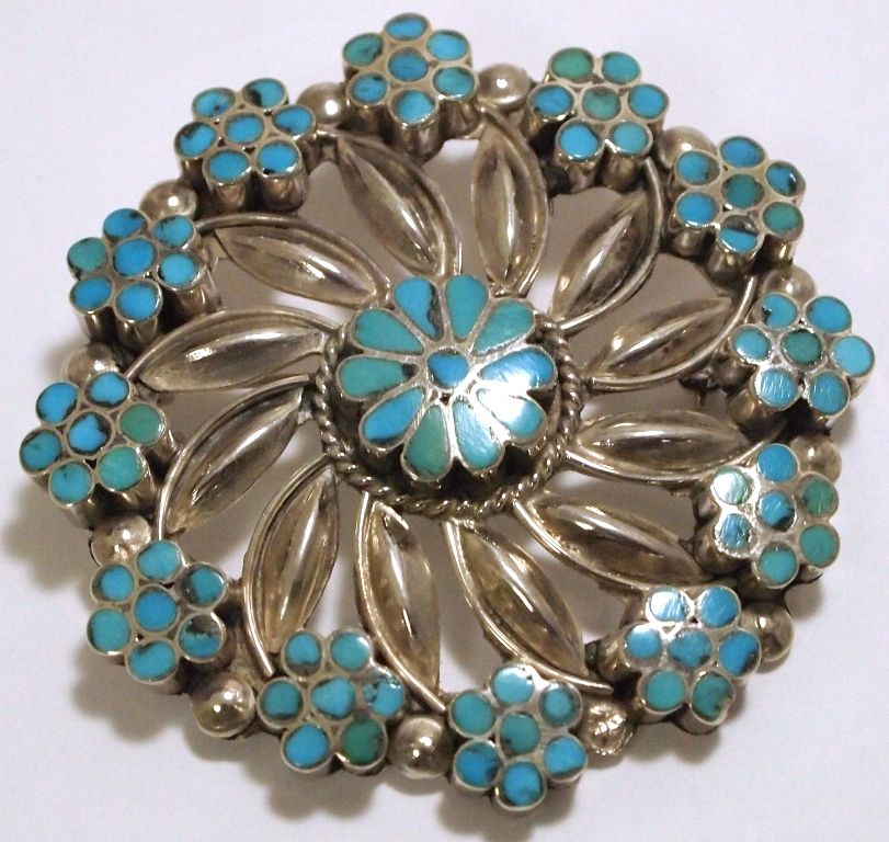 Old Pawn Zuni Turquoise Sterling Silver Flower Pendant & Pin - VM Dishta