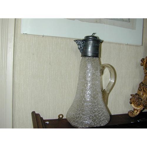 It is our pleasure to offer a terrific claret jug. The item is most attractive and has a presence. The body is covered with what one can describe as spun glass which is most interesting.