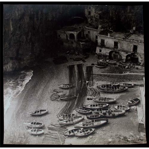 Beautiful old photo of row boats resting on a small beach cove next to an old house in ruins. It appears deserted except for a single man sorting out nets. In good used condition with minor signs of wear as shown. Please ask questions, request additional photos and shipping costs before buying.