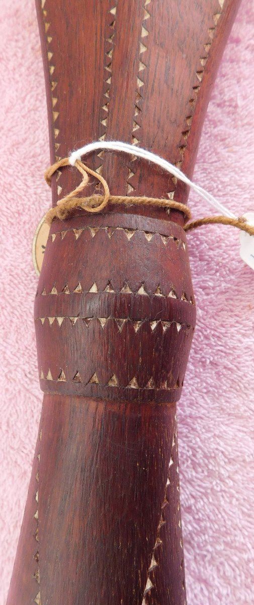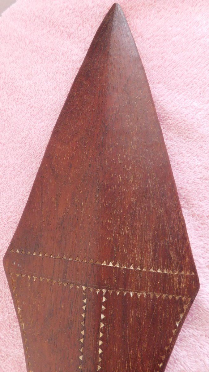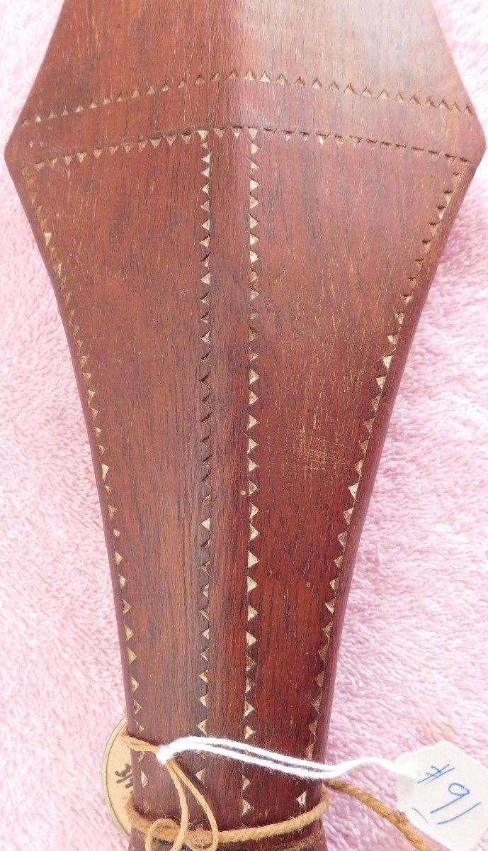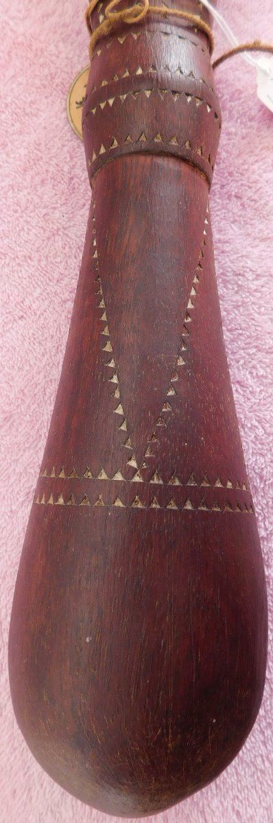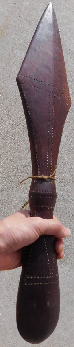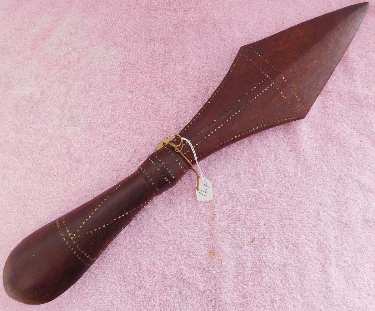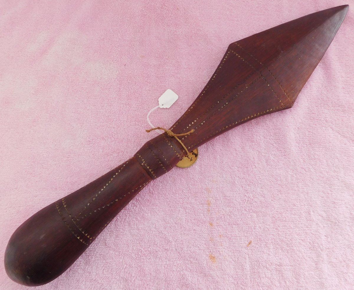 Old Polynesian War Club, circa WWII. Made of hardwood, the item is 23.5" long x 5". Probably Tonga. Nice polish, good shape, from an author's collection. Condition: Fine, see images. Shipping: $30.00 due to length, w/insurance and signature.