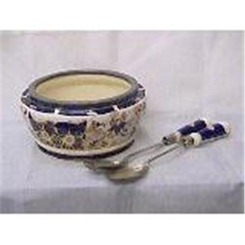 We are offering this beautiful English Porcelain salad set made by William Wood. The bowl is Porcelain with Pewter rim and Cobalt Blue and Ivory Cream color and on the base that designed with raised Gold and Ivory Cream color beads and some paintings of flowers all around it with altrnative panles of Cobalt Blue and Ivory color back ground.The spoon and fork are silver plated and have the same designes on Porcelain handles. (Spoon and Fork L:12"- W: 1.25")( Bowl H:4.1/2"- W:9") The Fork handle has a proffecional repair which is not noticeable. Some normal Gold Wear on the set.