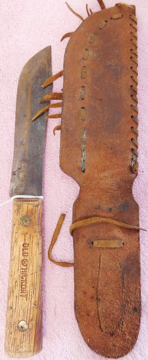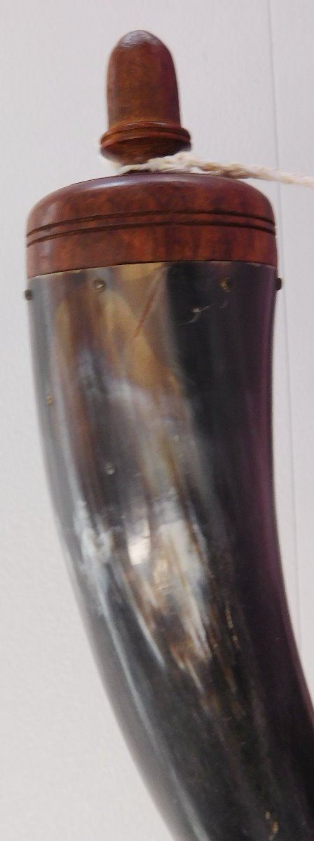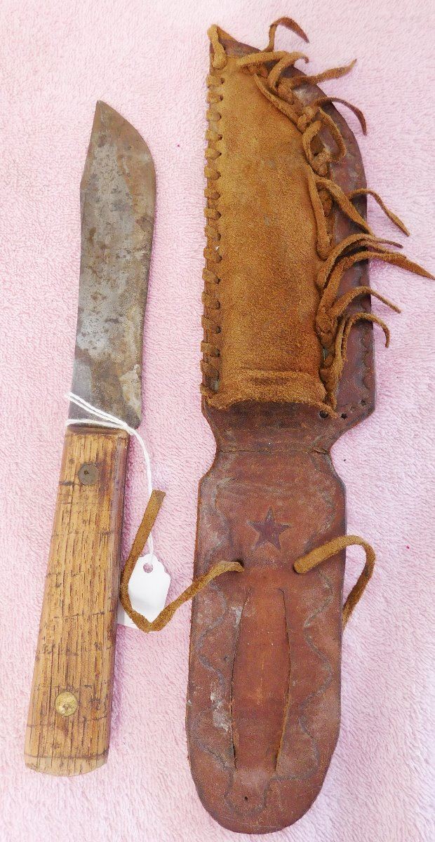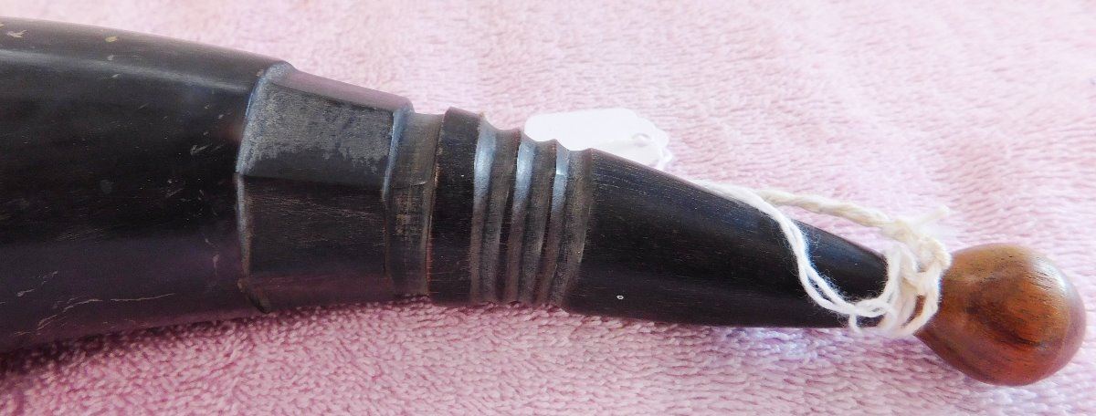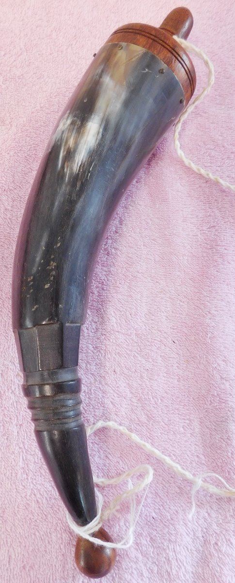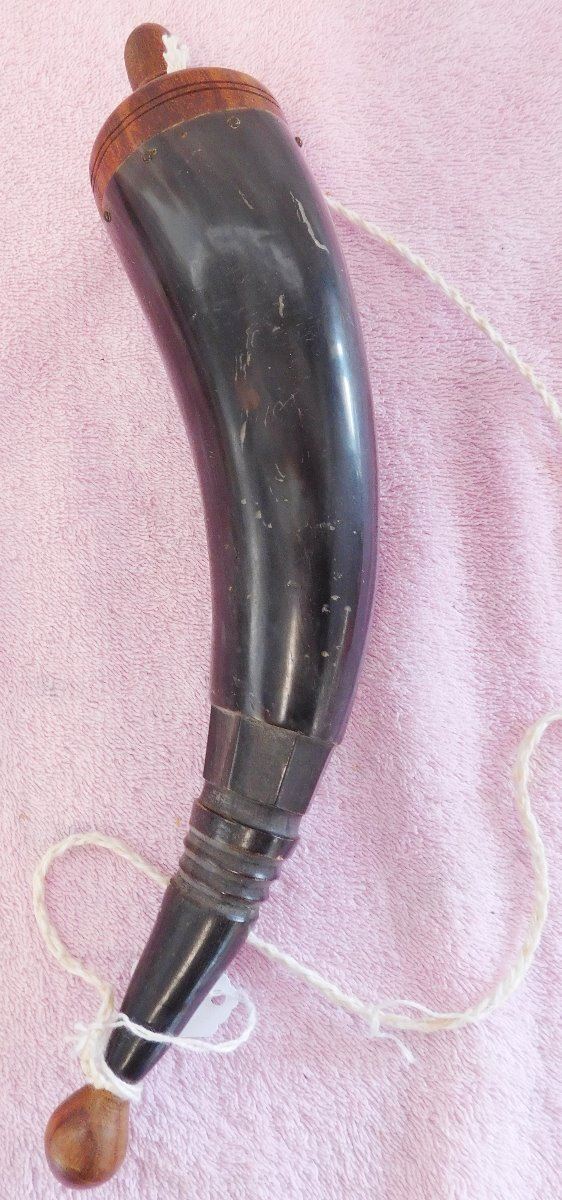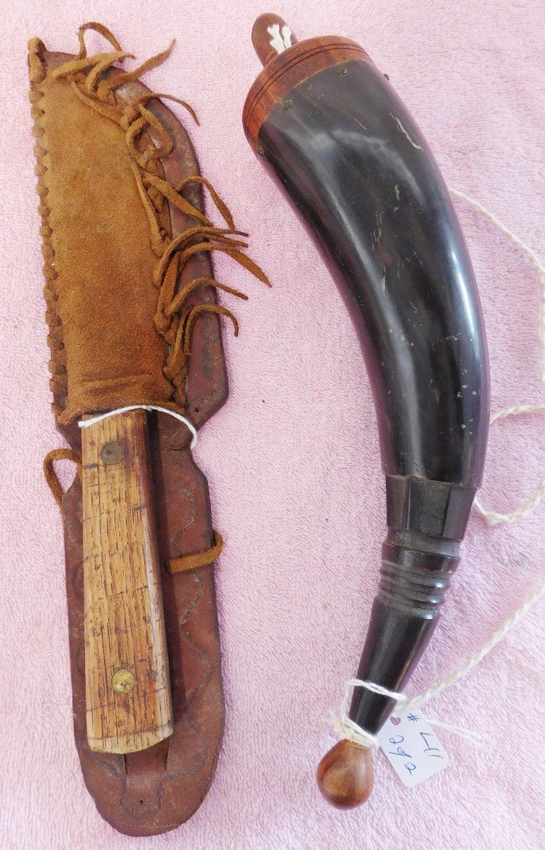 Old Powder Horn & Hunting Knife w/Sheath, circa 1930s. Made of horn, wood and steel, the knife in sheath is 13" x 3", the horn is 13" x 3" x 3". Mountain man items. Nice work on both. Condition: New string on horn, see images. Shipping: $30.00 w/insurance and signature.