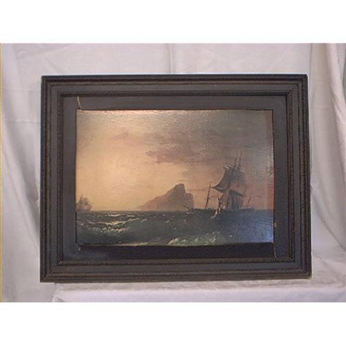 Ship print, very nice, but cannot find an artist name. The print measures 25 inches wide and 19.5 inches high. The print is in good condition for the age. It is in need of cleaning. The mat is torn. The frame is in only fair condition.