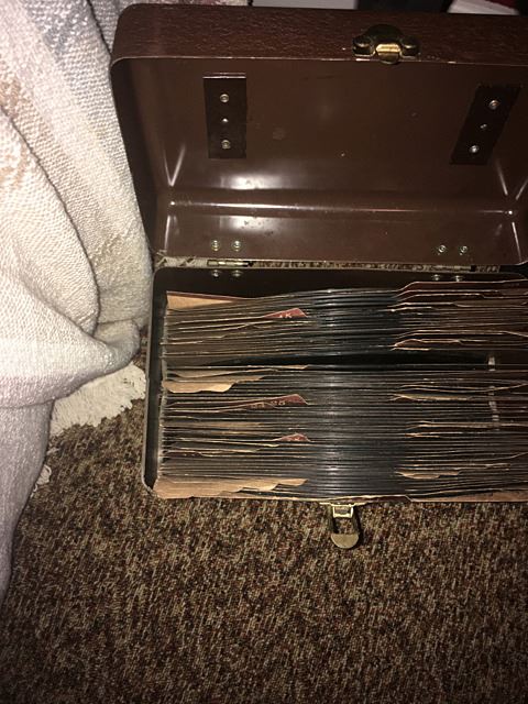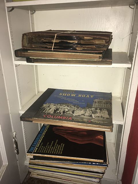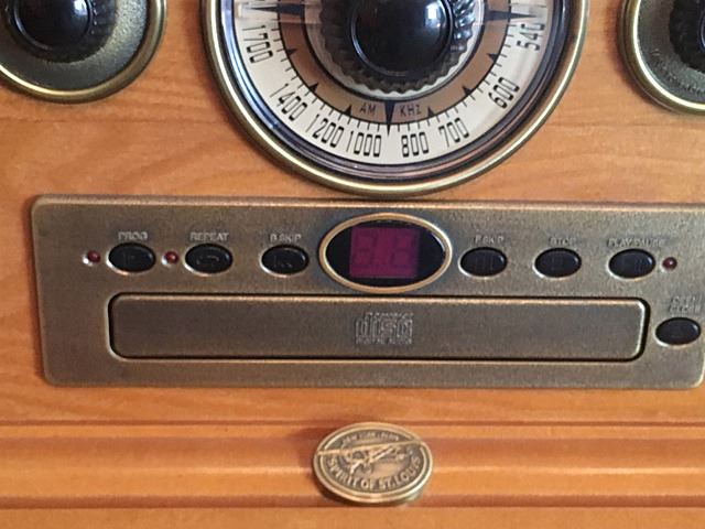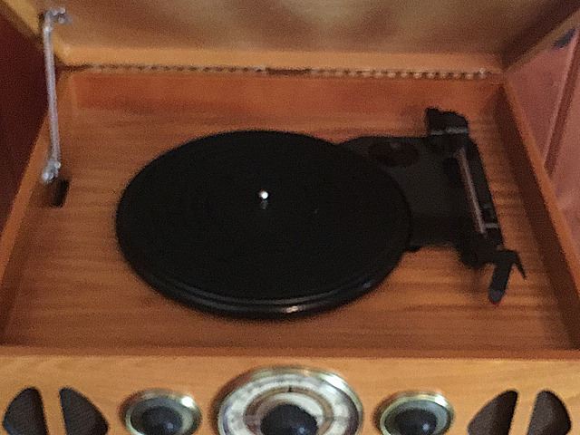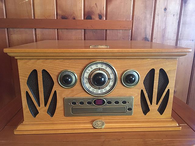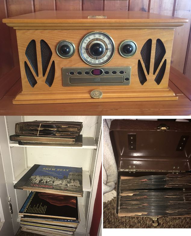 Turntable made to be replica of vintage radio with Spirit of St. Louis, turn table with compact disc player, collection of vinyl records.