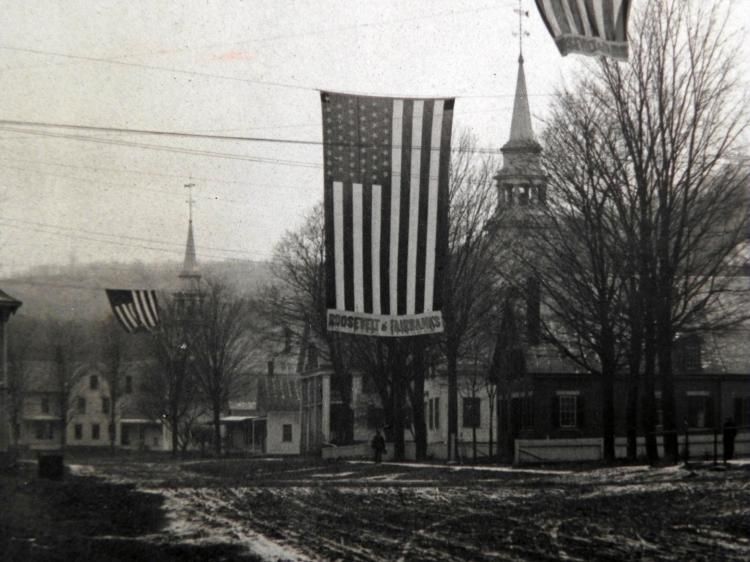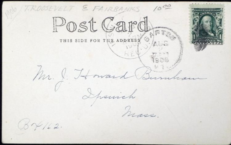 This is an original real photo postcard depicting a main street in a small town with flags and Roosevelt & Fairbanks banner. It is in excellent condition, with crisp detail. The message is on front. The back is postmarked August, 1906, with Massachusetts delivery address. The size of the card is 3 3/8 x 5 3/8 inches. * This will be nice for collectors of RP postcards, Presidential images, and Teddy Roosevelt.