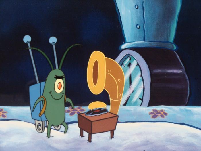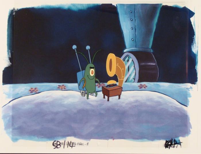This animation cel and reproduction background are from the Nickelodeon TV show SpongeBob Squarepants. The story takes place under the deep blue sea in Bikini Bottom, where SpongeBob resides. SpongeBob, who is a yellow, porous sponge, is your typical happy-go-lucky character, as he is always cheerful and enjoys making people laugh. Patrick Star, SpongeBob's neighbor who is a starfish, is your average children's show idiot, as he boasts knowing nothing and is often getting himself into ridiculous situations. Between the homes of these two lies the home of the miserable Squidward, a squid, who is known for being grouchy and playing tricks on SpongeBob and Patrick. Both SpongeBob and Squidward work at the Krusty Krab, a fast food business run by the greedy money-loving Mr. Krabs, a crab, the arch rival of the evil, possibly misunderstood, Plankton. Another neighbor, Sandy Cheeks, an athletic squirrel who normally wears an astronaut's space suit, was introduced in "Tea at the Treedome." She spends most of her time inventing and experimenting. Plankton is next to his old record player.Original Printed Background and Animated Cel Overall Size of Background: 11" x 17" Overall Size of the Cel: 10 1/2" x 12 1/2" Very good condition This is an original hand-painted cel set-up used in the production of an episode of "SpongeBob SquarePants." Each one-of-a-kind set-up represents a slight change in position of the characters. When individually photographed and projected in rapid succession, the images appear to move.
