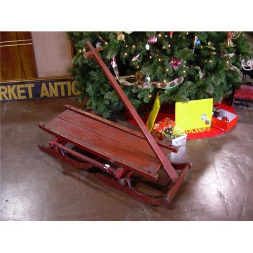 Up for sale is a great old primitive sled or toboggan. It has a long wooden handle, where you could either tow the sled behind you, or you could stand on the sled with the handle in your hands (for those more adventurous). The sled measures almost 4' long and the handle measures another 3.5' long. Condition is pretty good; the paint on the sled has a few worn spots and is slightly chipping, but that is part of its charm--and its value as an antique. The bottom runners are metal attached to the wood, so it will slide quite nicely on the snow we should be receiving soon. If you have any other questions, please email us. Thanks for looking!!