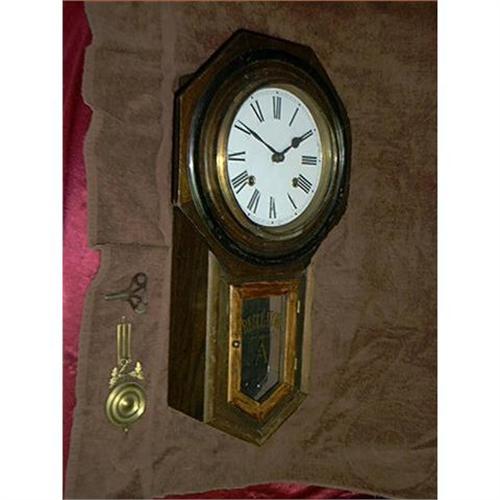 Old Regular Wall Clock w/ Key and Pendulum. It has a real neat Pendulum as it has a gold leaves on each side of it, really nice looking. It works really great and the black back paper is starting to peal, and it is showing it's age, but still looks great and chimes well, and keeps good time. It is 22" H X 12" on Top and is 5" deep. It is all there and looks good and works great, and what more do you want from a old wall clock. I like it and hope you do to. Enjoy. Came out of a great estate and is working so great. All I did was hang it and wind it, and it is just great.