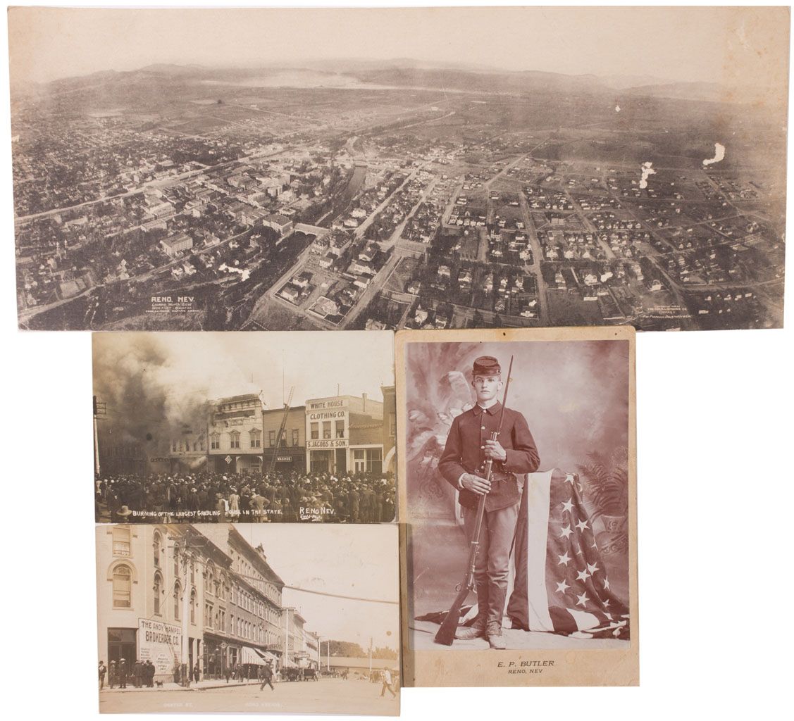 1908 - This is a lot four black and white photos taken in the mid 19th century and the early 20th century. Scenes include a panoramic birds eye view of Reno in 1908. This photo was taken by George Lawrence utilizing his famous "Captive Airship" process, a method utilizing a kite set-up and stabilizer. He had used the process shortly after the 1906 Earthquake in San Francisco. His photos were seen worldwide and are still considered as the consummate depiction of the devastation that took place on that April morning. The photo measures 13.5" x 5.5" and there are two small scraps and some soiling on the right side. Also included is a photo postcard with the heading "Burning of the Largest Gambling House in the State" in 1909.