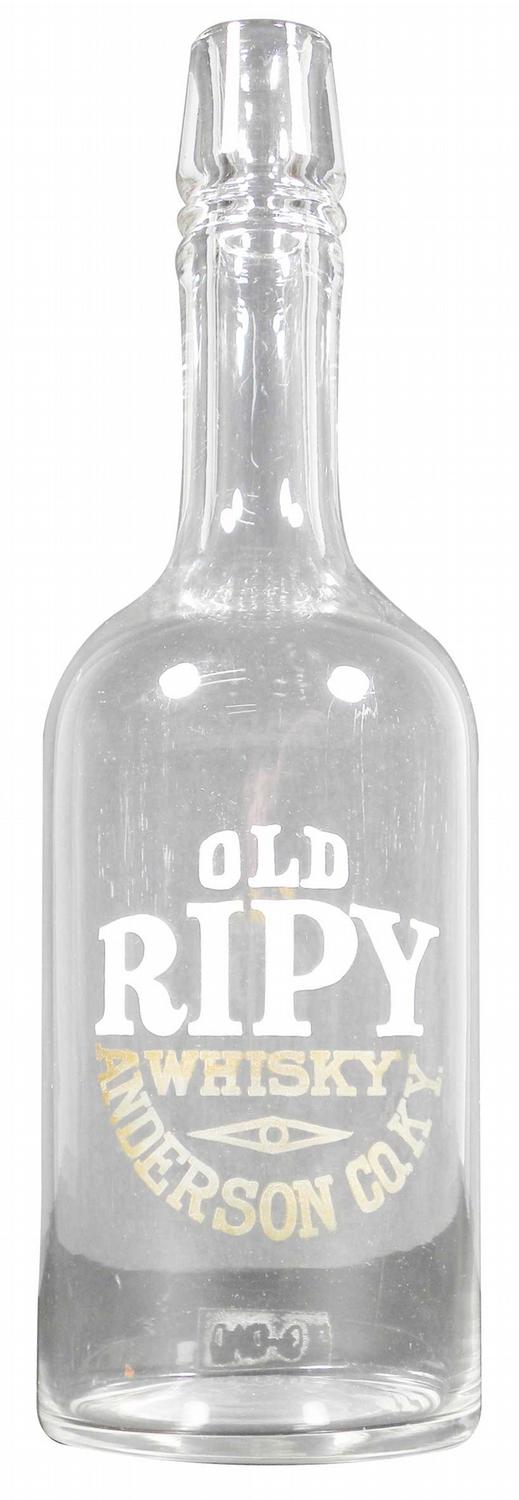 Old Ripy Whiskey Enameled Label Bottle. Anderson CO. KY. No chips or cracks. 11 1/2 inches tall.