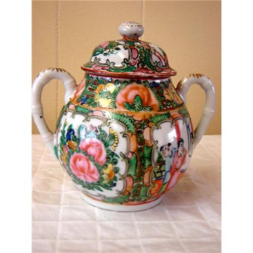 <tr><td>Title:Old Rose Medallion Sugar Bowl w/lid, c.</td></tr>