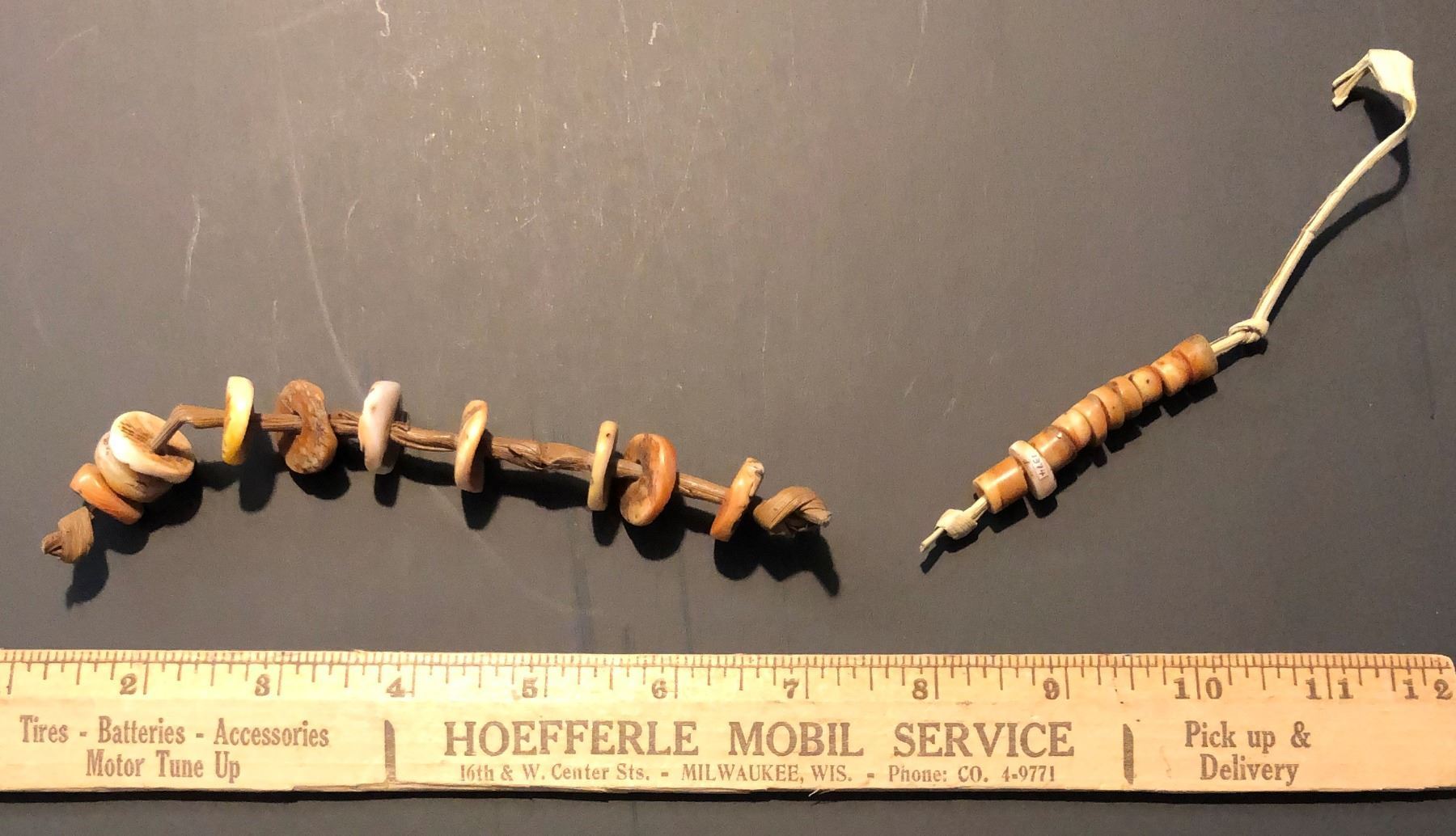 Description: Rossel Island nkö, on the other hand, is simply a string of ten roughly-shaped shell disks; none have been made for a long time, and the natives believe every piece to be of great antiquity. There are 16 values of nkö; two of these 16 kinds are present in this lot. See Quiggin, pp. 183-86, Plate 18, and Opitz, pp. 236-37 (one of these examples illustrated on p. 239, left center).