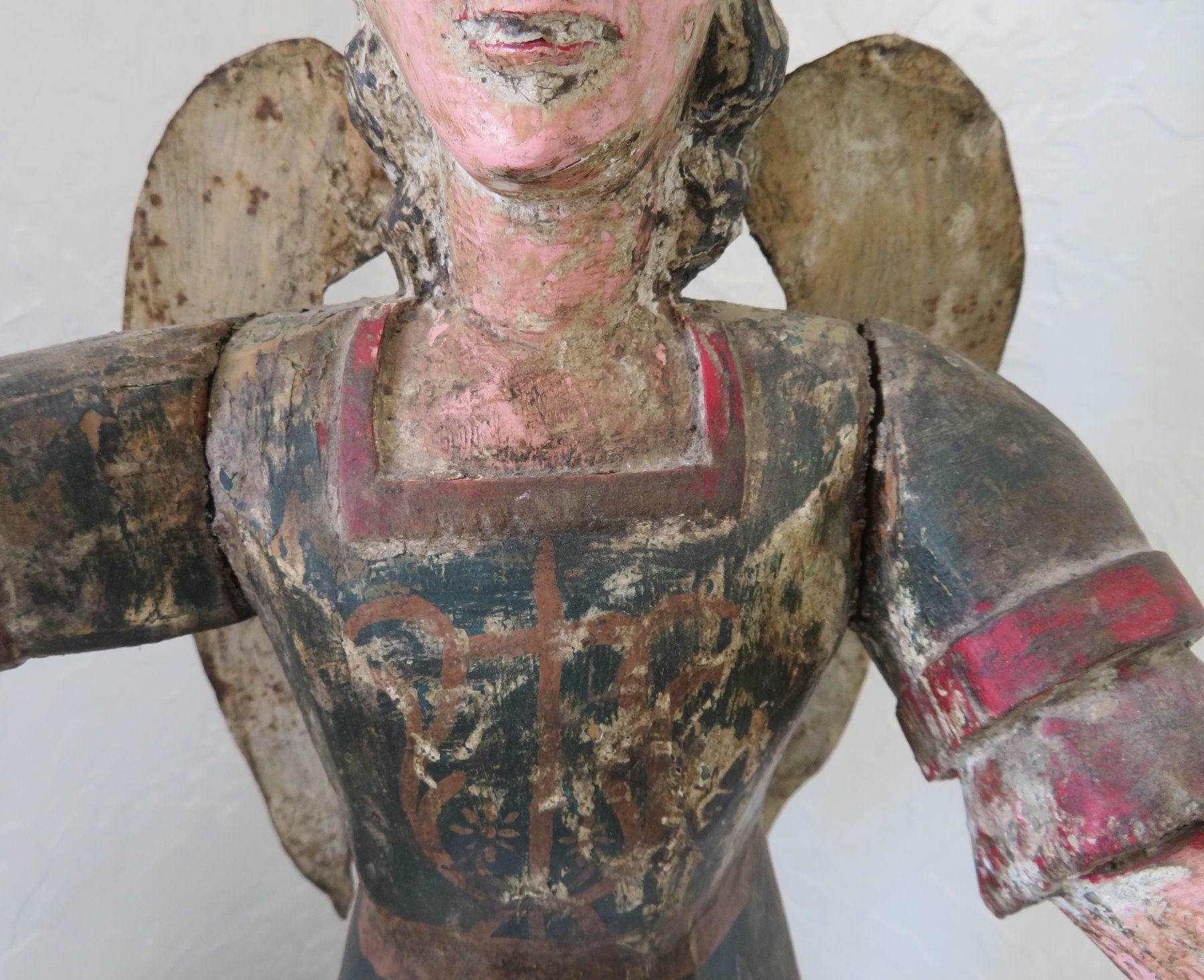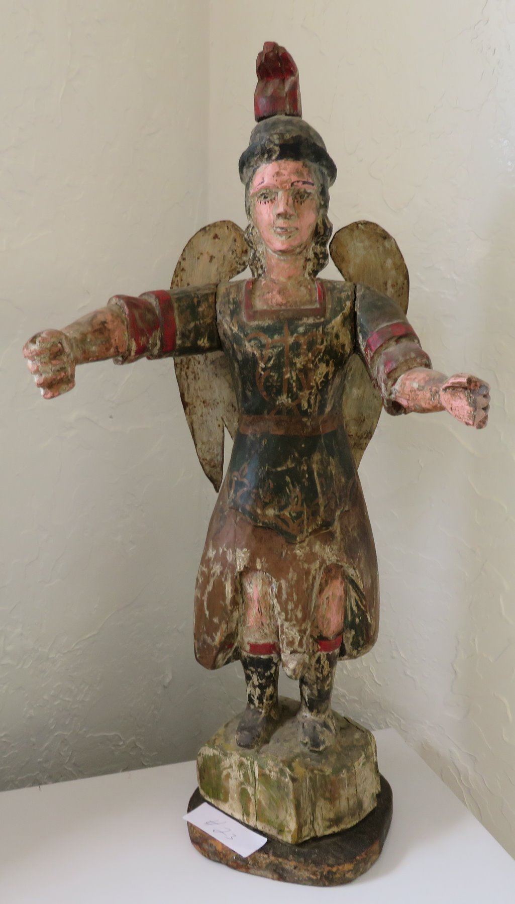 Old Santo Figure, c. 1800s. Made of tin, wood and paint, the item measures 23" x 11" x 9". Mexico. Condition: Fingers missing, paint loss, see images. Shipping: $55.00 USA estimate only, w/insurance and signature, double-boxed.
